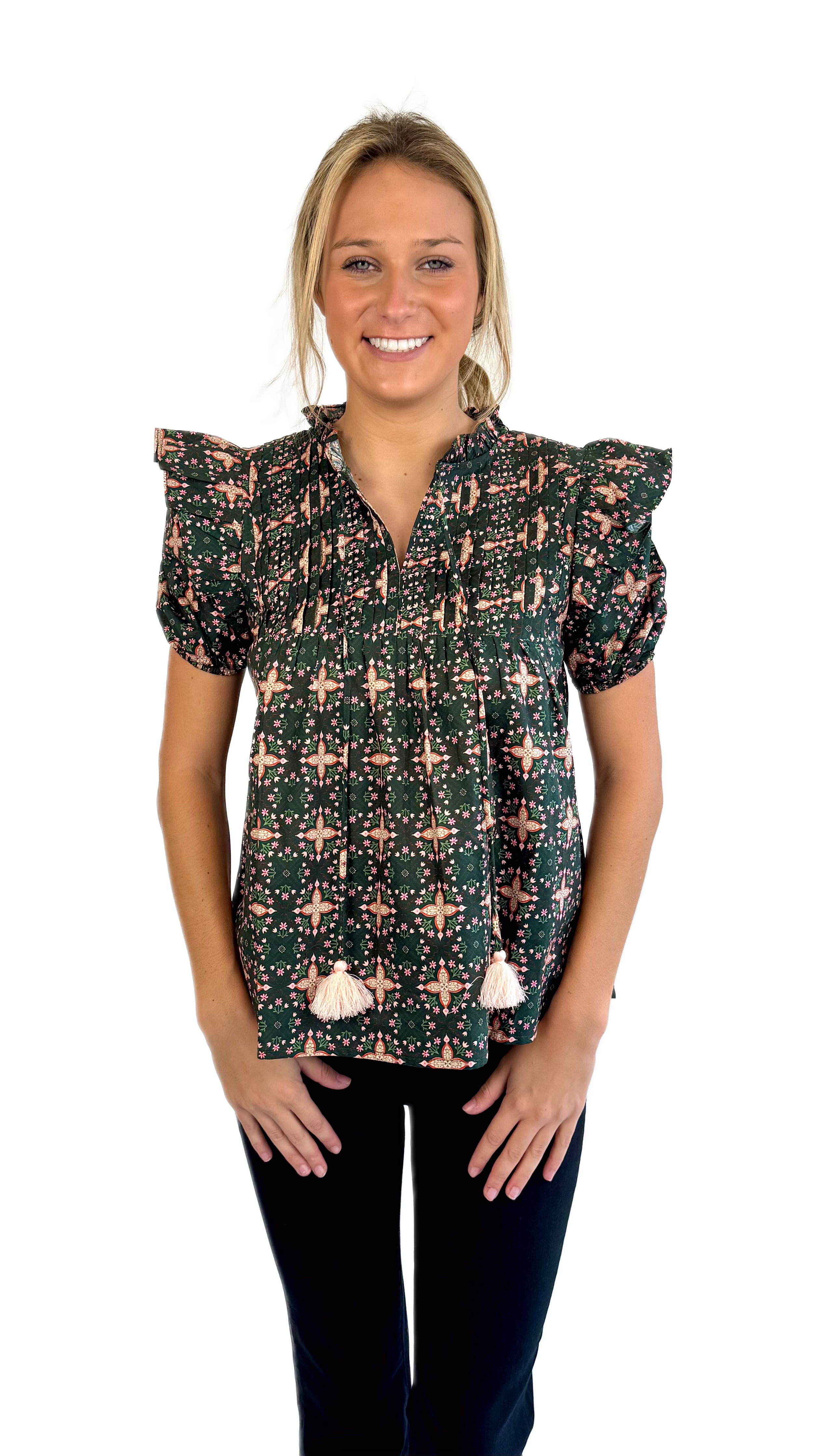 Pleated v neckline with tassel ties